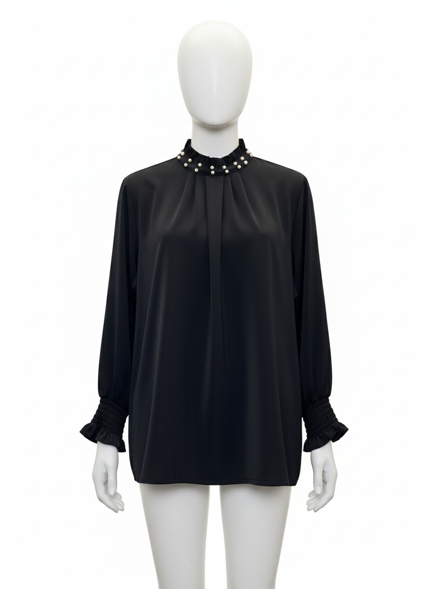 Blusa negra con detalles de perlas en el cuello, elegante y cómoda, perfecta para looks sofisticados.