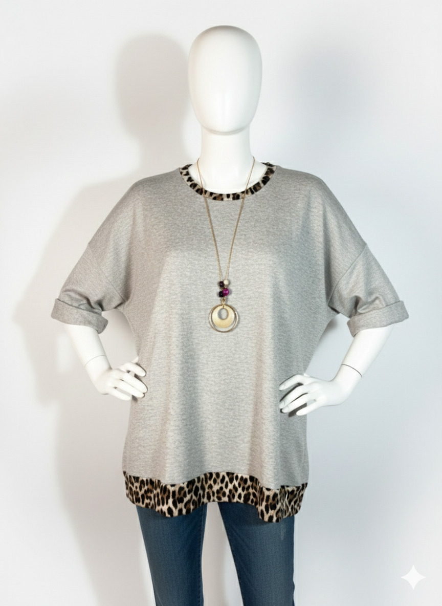 • Blusa gris con borde de leopardo que añade un toque moderno.
