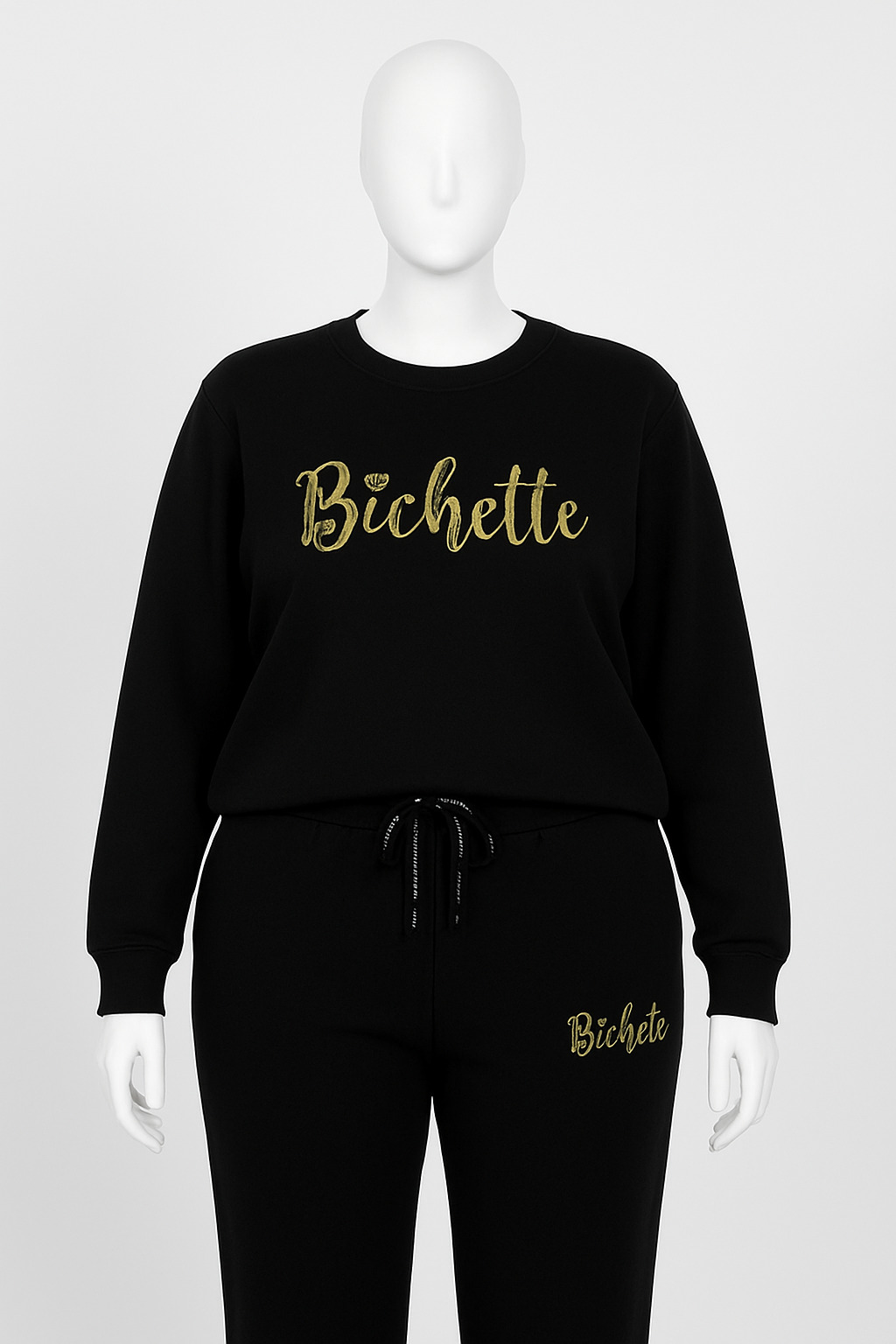 Descubre la combinación perfecta entre moda y confort con nuestro Conjunto Chándal Gold, un conjunto elegante y moderno que no puede faltar en tu armario si buscas un look casual con un toque sofisticado. Con su tejido negro suave y diseño de letras doradas, aporta un aire chic y minimalista, ideal tanto para estar cómoda en casa como para salir con estilo. 🖤