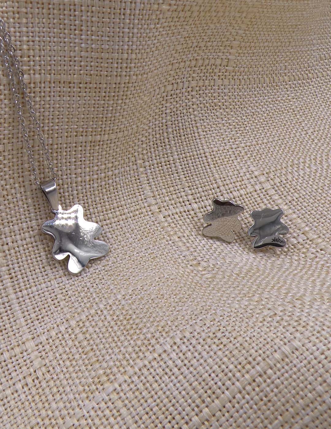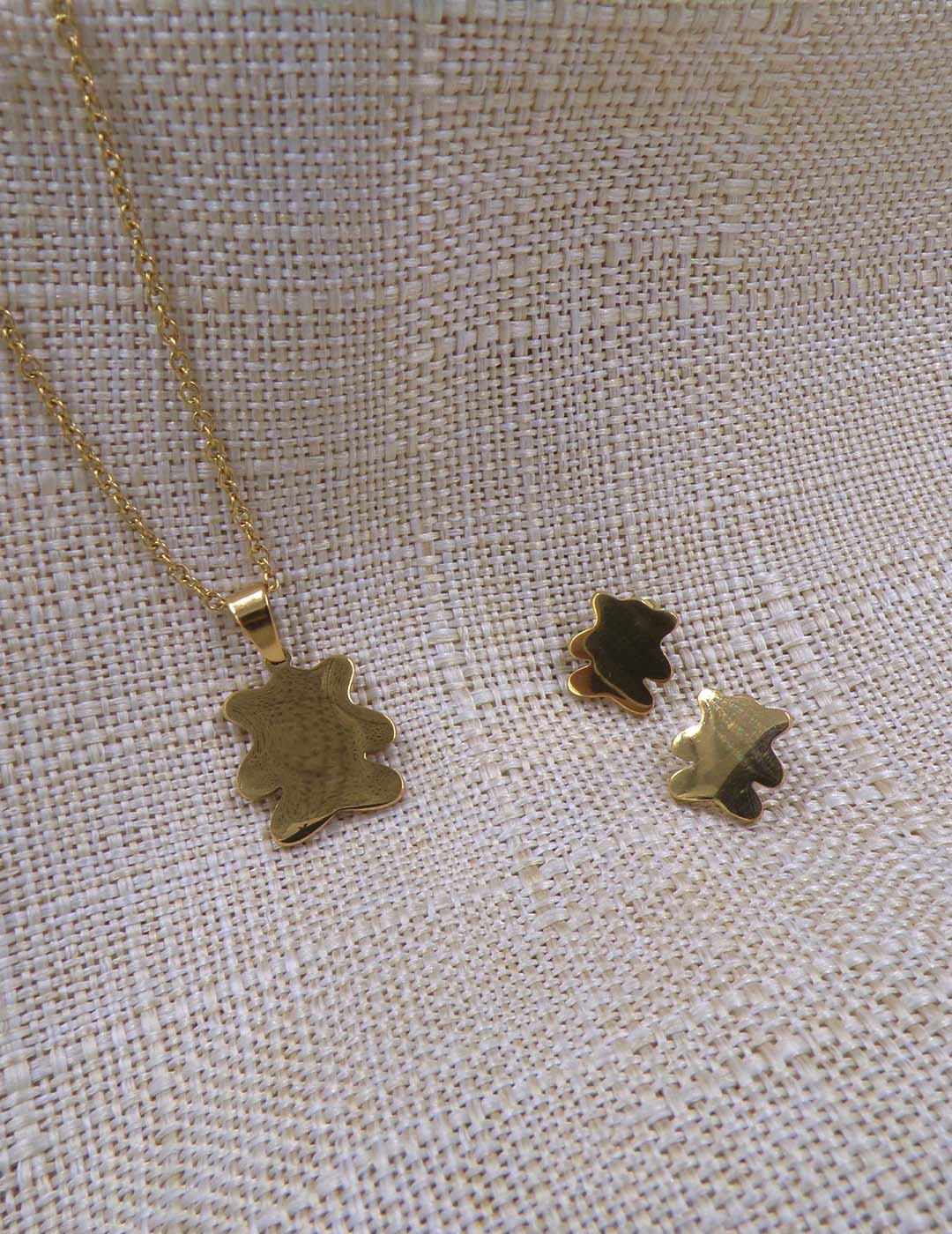Conjunto de collar y pendientes con diseño de osito, disponible en plateado o dorado. Hecho en acero inoxidable, resistente y adorable.