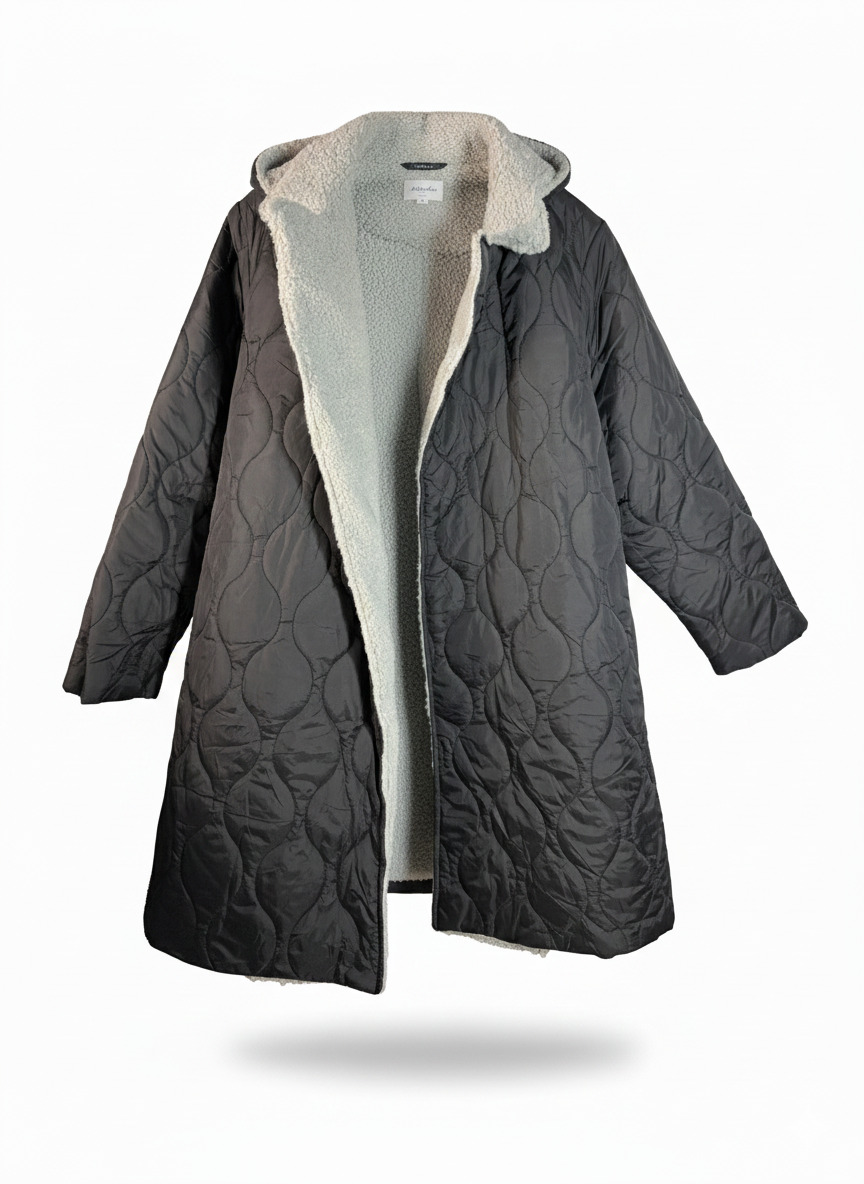 Abrigo acolchado largo tipo midi negro con forro interior de borreguito gris o beige, perfecto para un look elegante y cálido.