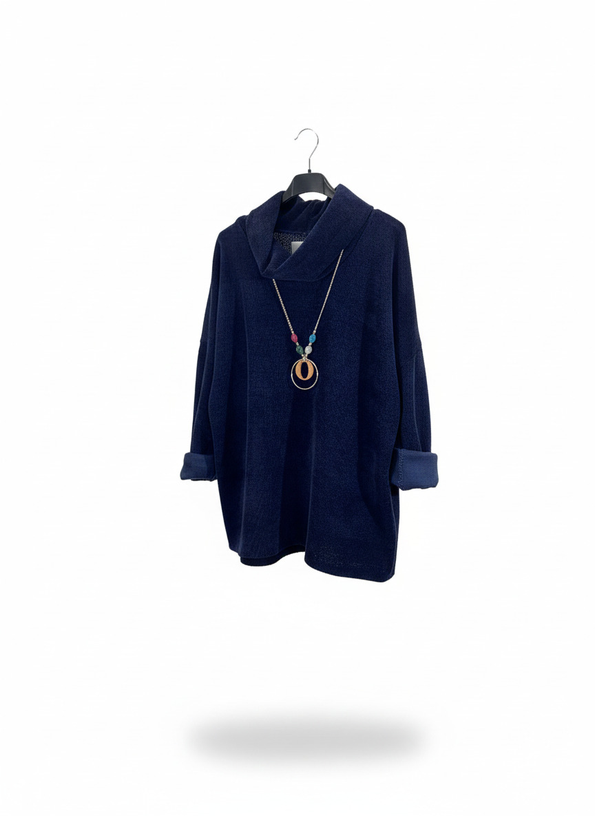 El Suéter Esther es una prenda cálida y elegante confeccionada en pana suave, perfecto para tus looks de otoño e invierno. Incluye un collar decorativo que aporta un toque extra de estilo sin esfuerzo. Disponible en azul marino y negro.