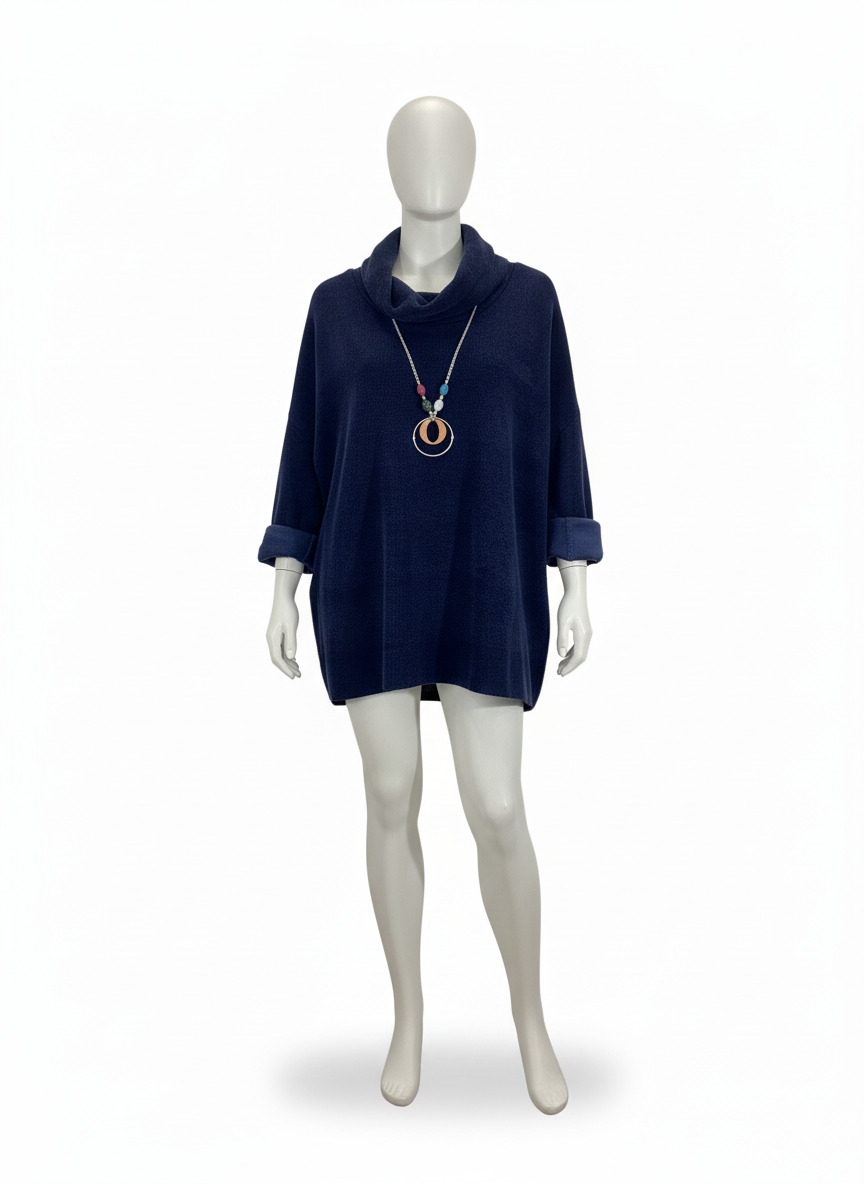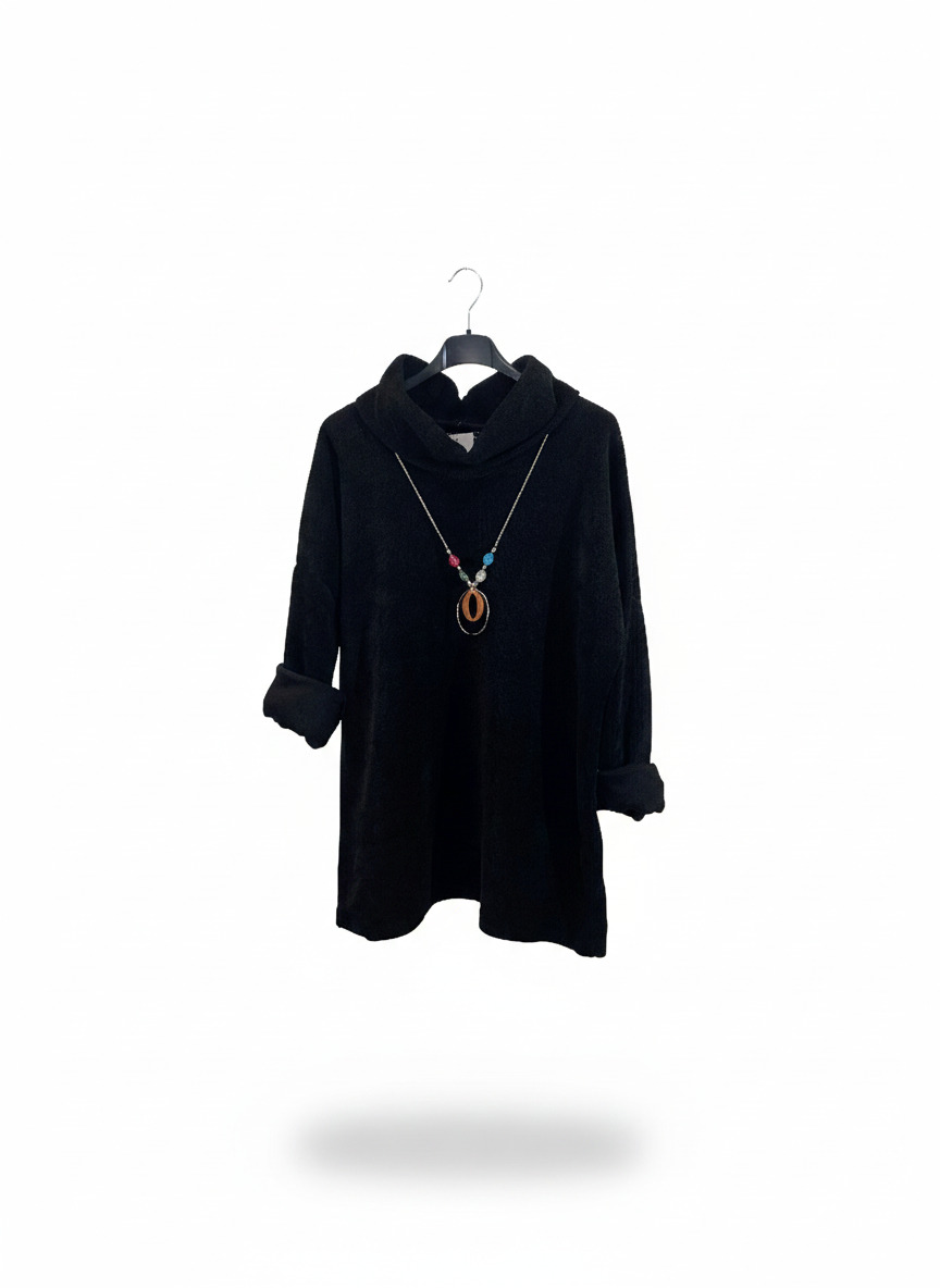 Suéter de pana con cuello vuelto y collar incluido, disponible en negro y azul marino.